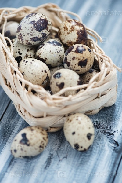 Сырые перепелиные яйца в плетеной корзине