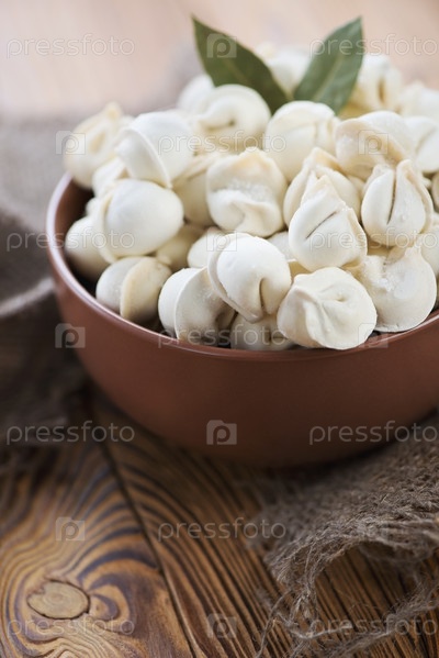 Сырые пельмени в керамической тарелке