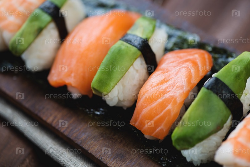 Суши с лососем, креветками и авокадо
