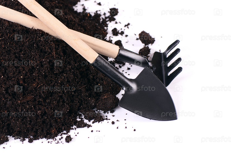 Почва и инструменты на белом фоне