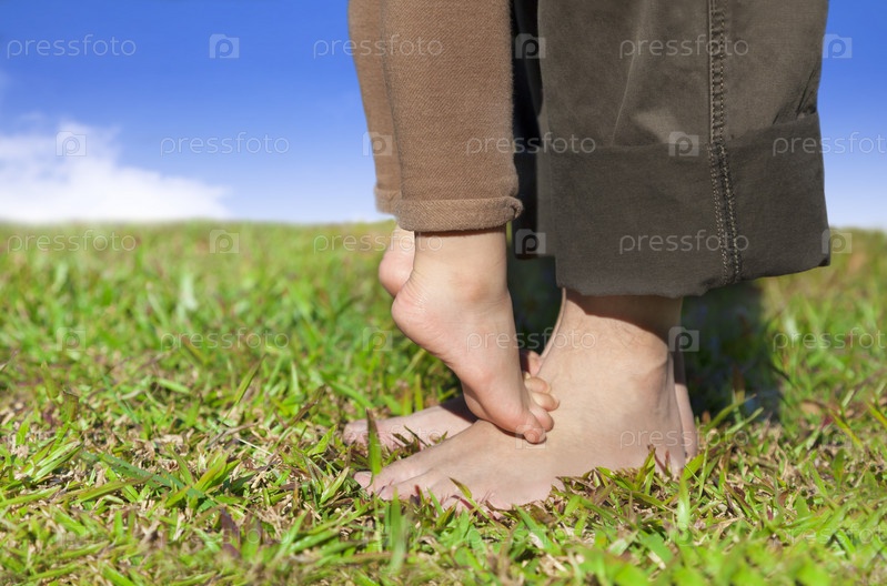 Ноги отца и ребенка на траве