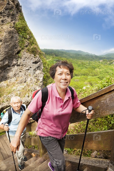 Счастливая пожилая пара в походе