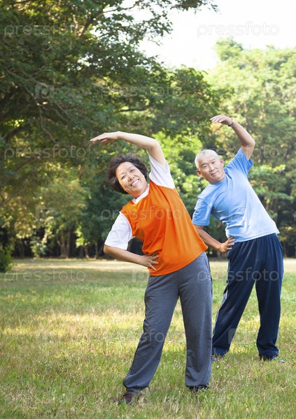 Азиатская пожилая пара занимается фитнесом в парке