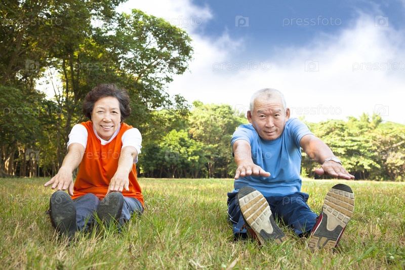 Азиатская пожилая пара занимается фитнесом в парке