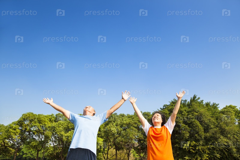 Азиатская пожилая пара занимается фитнесом в парке