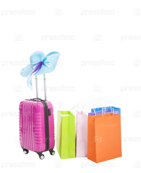 Чемодан и пакеты на белом фоне