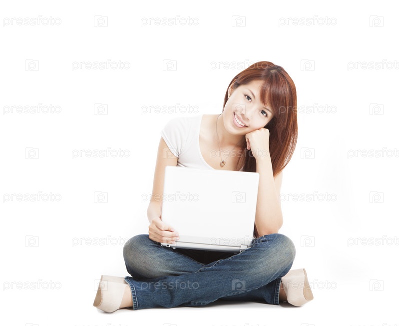 Улыбающаяся молодая женщина с ноутбуком