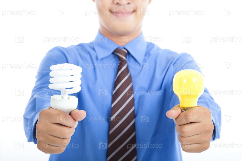 Улыбающийся бизнесмен держит энергосберегающую и обычную лампочку