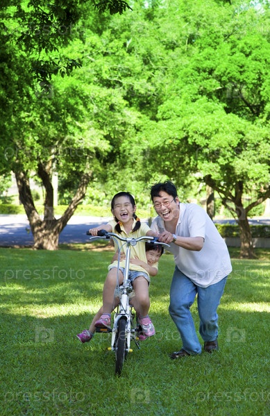 Отец с двумя дочерьми на велосипеде