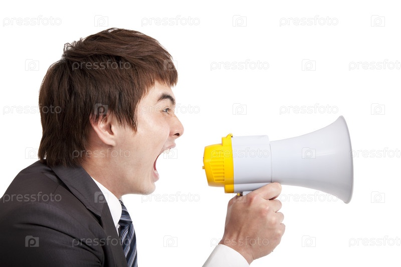 Молодой бизнесмен кричит в мегафон