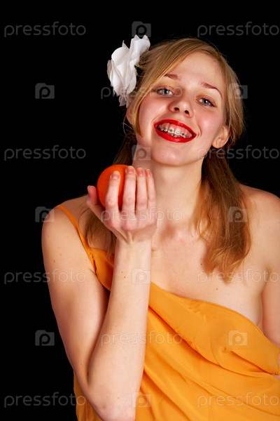 Молодая девушка с апельсином в руке на черном фоне