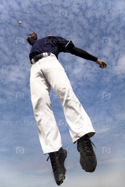 Бейсболист ловит мяч в прыжке