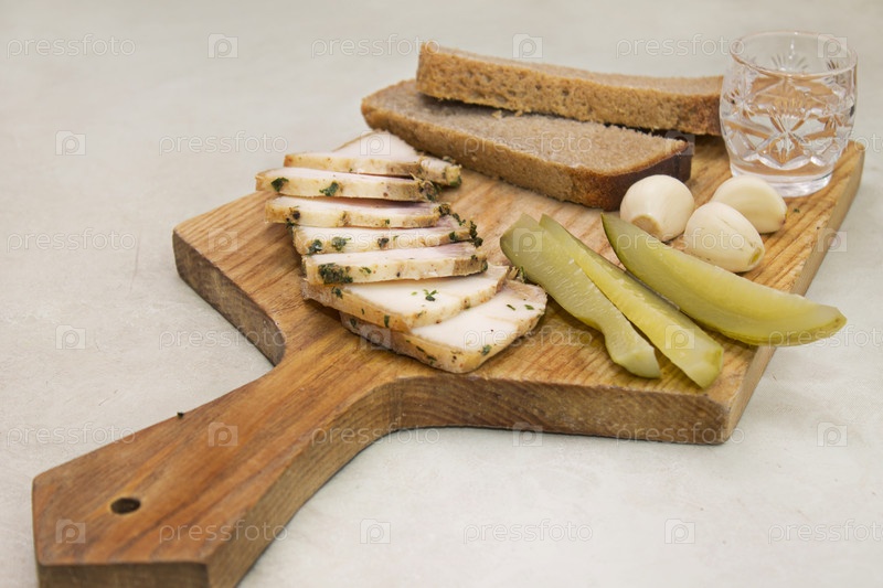 Сало с чесноком, маринованный огурец