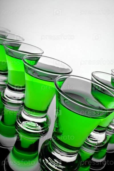 Стеклянные стопки с зеленой жидкостью крупным планом