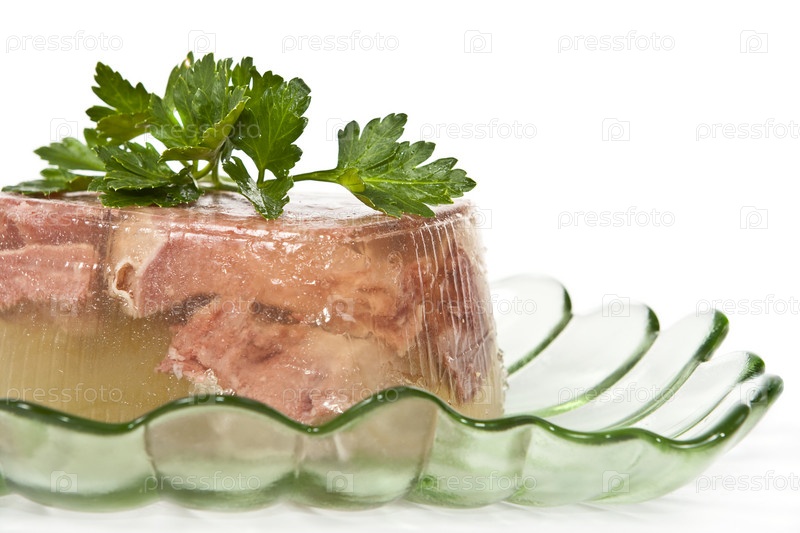 Свежий холодец с зеленью на тарелке на белом фоне