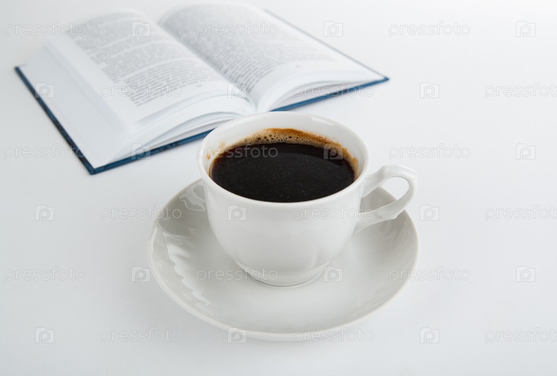 Чашка кофе с открытой книгой на белом фоне