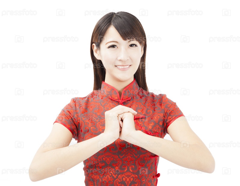 Китайский Новый год. Азиатская женщина с поздравительным жестом