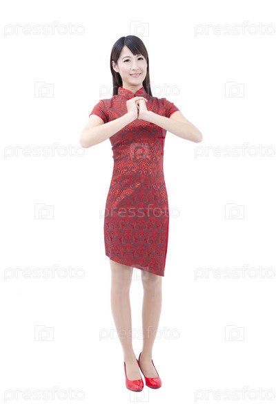 Китайский Новый год. Азиатская женщина с поздравительным жестом