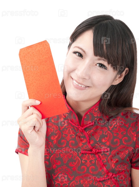 Красивая азиатская девушка держит красную сумку