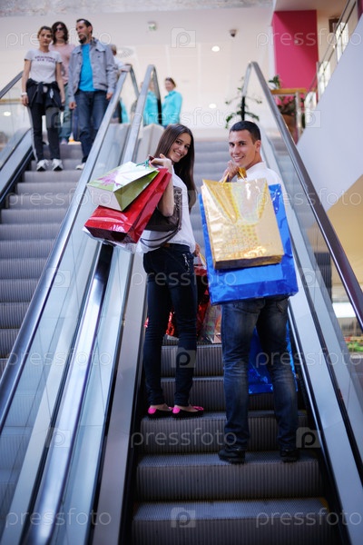Счастливая молодая пара в торговом центре