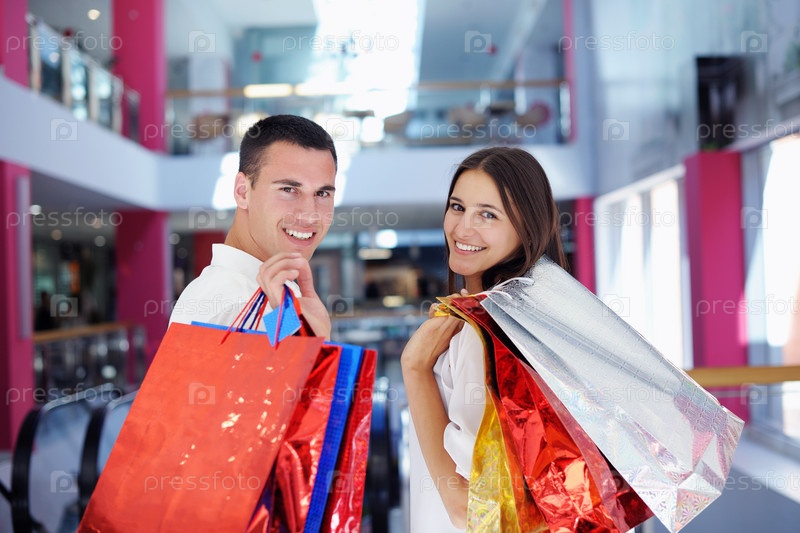 Счастливая молодая пара в торговом центре