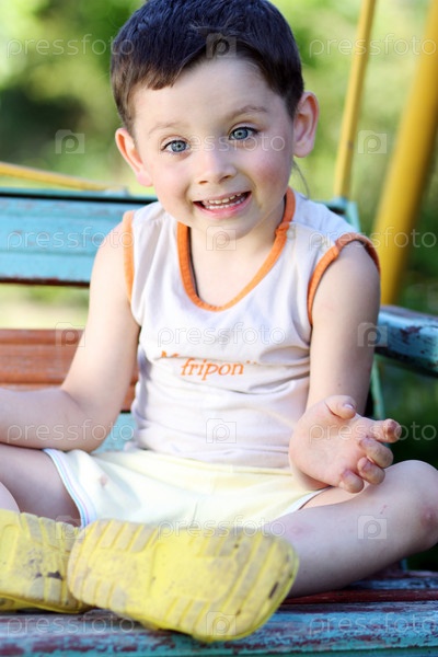 Темноволосый мальчик сидит на качелях
