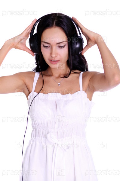 Брюнетка в наушниках на белом фоне