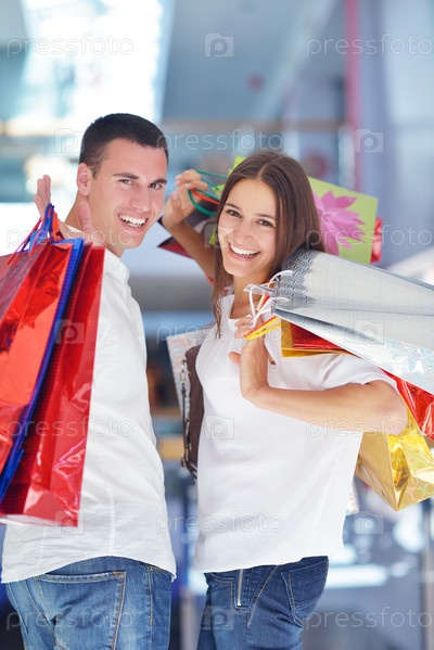 Счастливая молодая пара в торговом центре