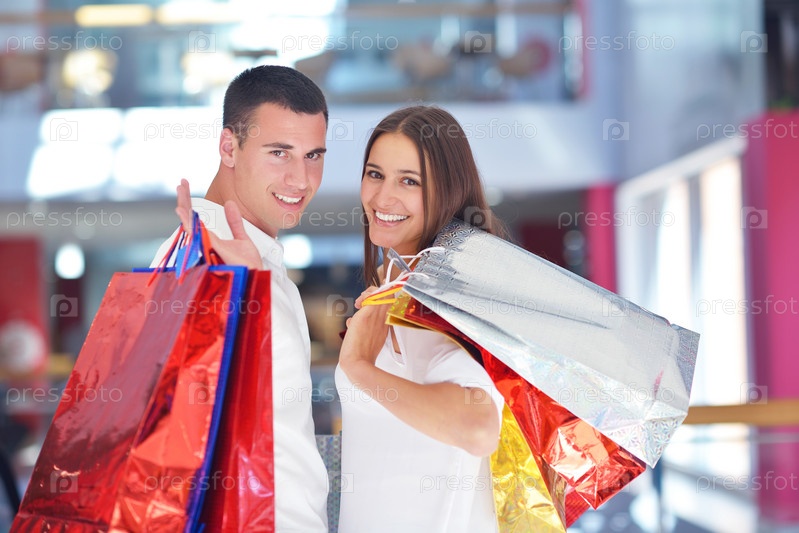 Счастливая молодая пара в торговом центре