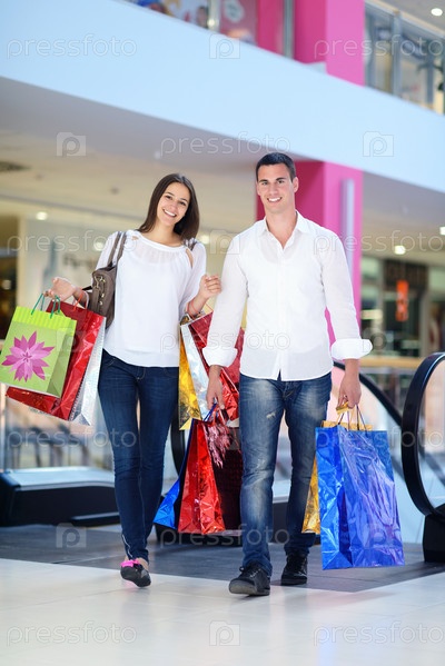 Счастливая молодая пара в торговом центре