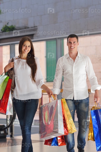 Счастливая молодая пара в торговом центре