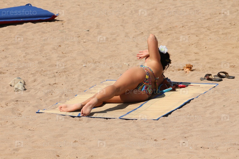 Молодая женщина загорает на пляже