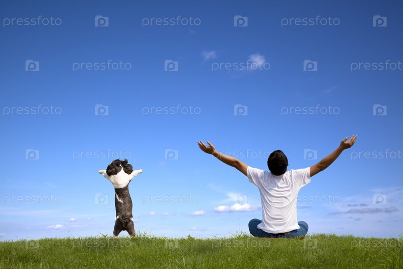 Молодой человек с собакой отдыхают на поляне
