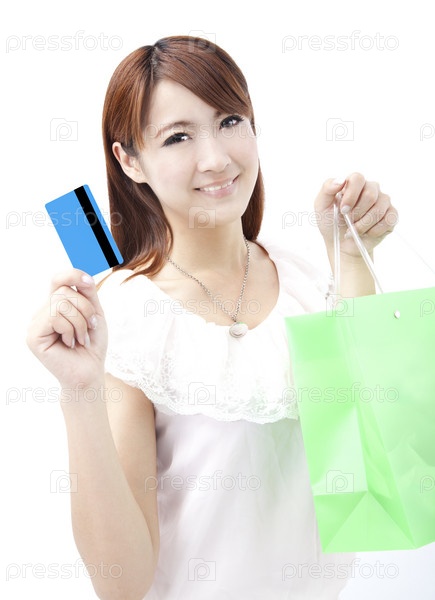Молодая женщина с кредитной картой и покупками