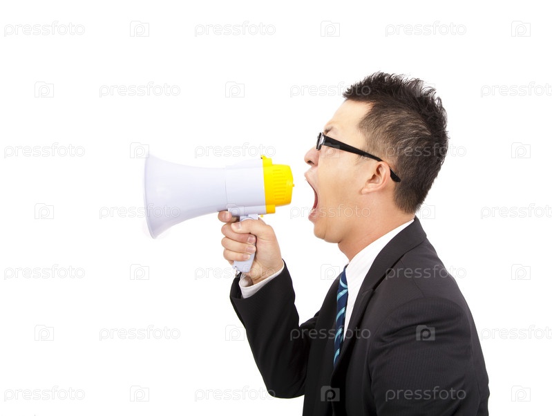 Молодой бизнесмен кричит в мегафон