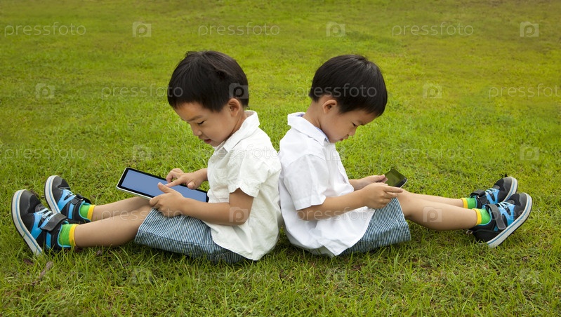 Двое детей с планшетами на траве