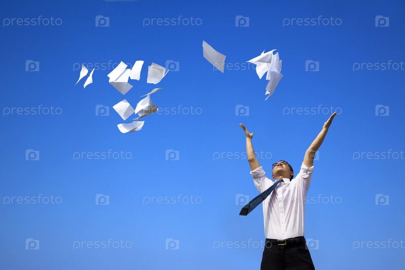 Деловой мужчина бросает документы в небо