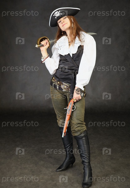 Девушка, одетая в пирата и стоящая на черном фоне с мечом
