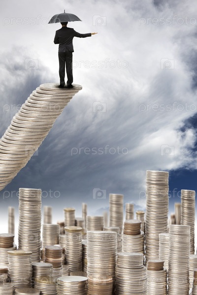 Бизнесмен стоит на стопке наклонившихся монет