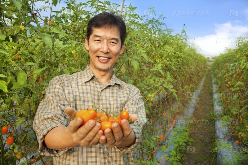 Фермер со спелыми помидорами