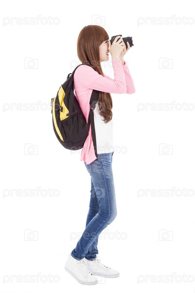 Молодая женщина с рюкзаком и фотоаппаратом