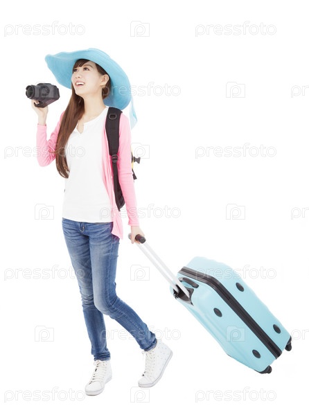 Молодая женщина в шляпе с чемоданом