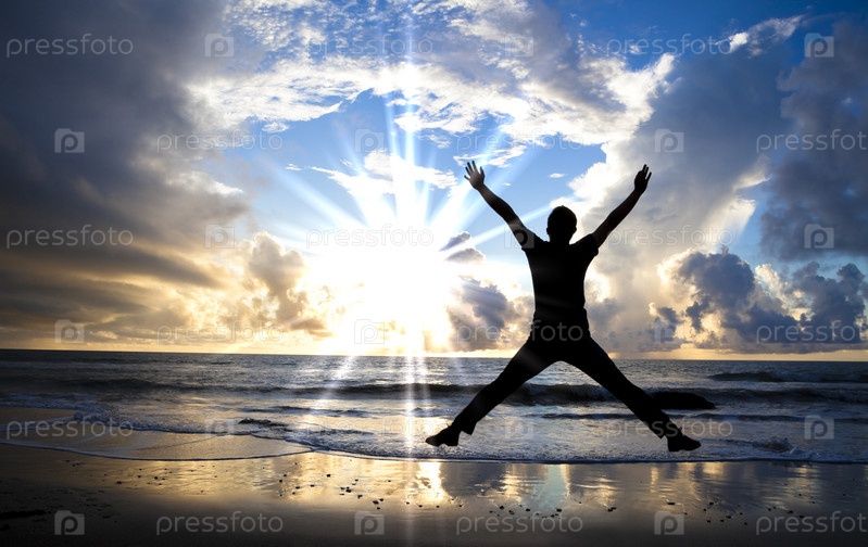 Счастливый человек прыгает на пляже