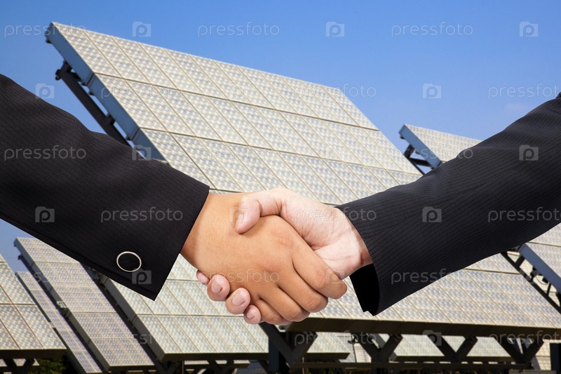 Деловое рукопожатие на фоне солнечной электростанции