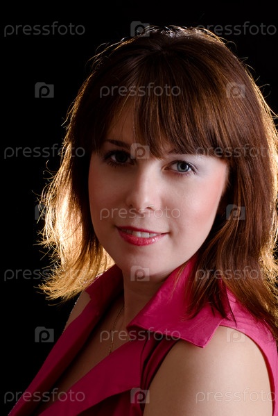 Портрет красивой девушки с коричневыми волосами и серыми глазами на черном фоне