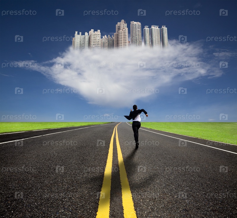 Бизнесмен бежат по дороге в голод будущего