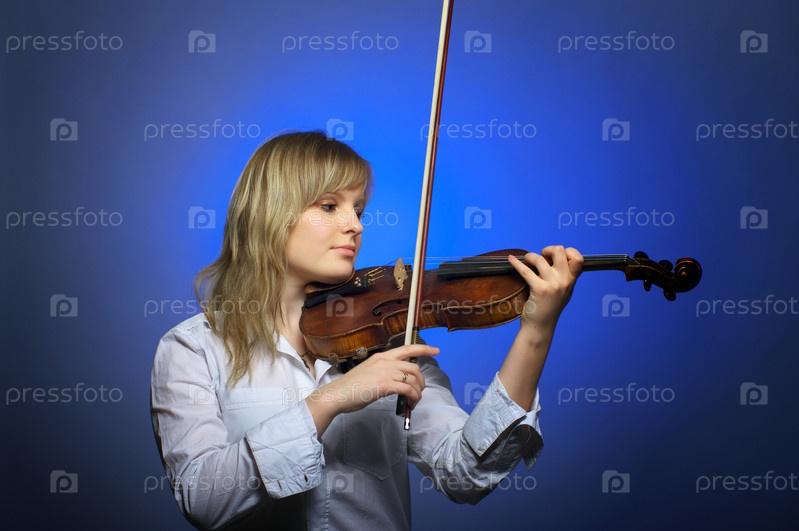 Очаровательная девушка-скрипач на голубом фоне
