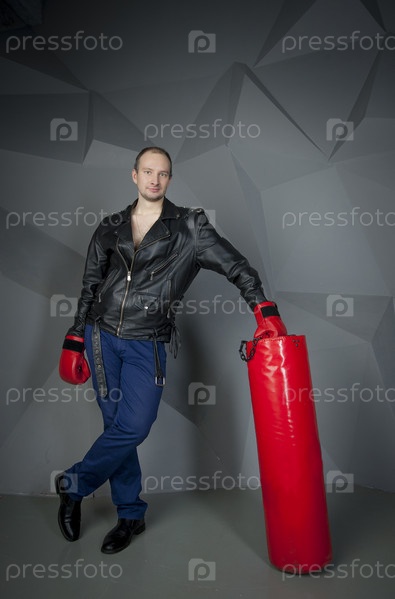 Мужчина с грушей и боксерскими перчатками