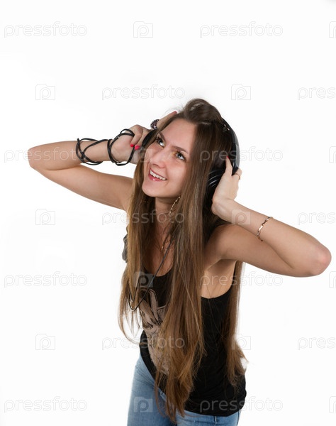 Молодая симпатичная девушка слушает музыку на белом фоне