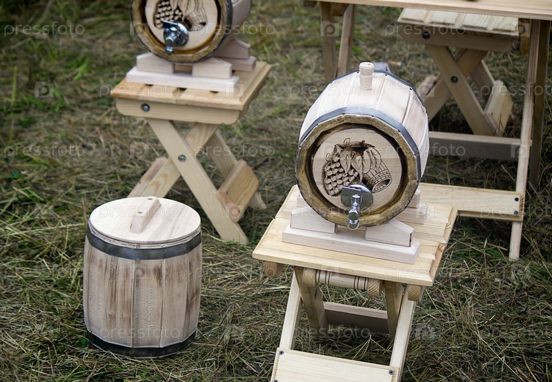 Деревянная дубовая бочка вина с металлическими краном на ярмарке